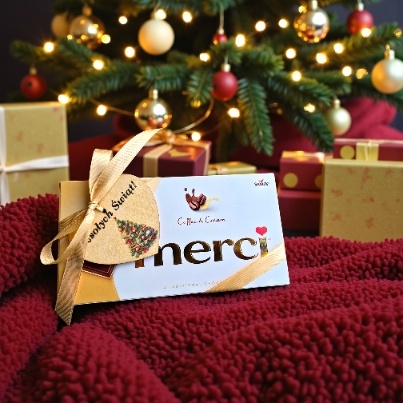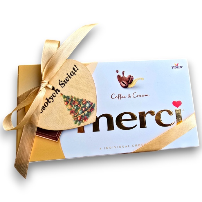 Czekolada Merci 100 g w pysznym, kawowo-śmietankowym smaku została ozdobiona złotą, przewleczoną wstążką, na której zawieszono drewniane serduszko z trwałym nadrukiem „Wesołych Świąt” oraz kolorową choinką.
