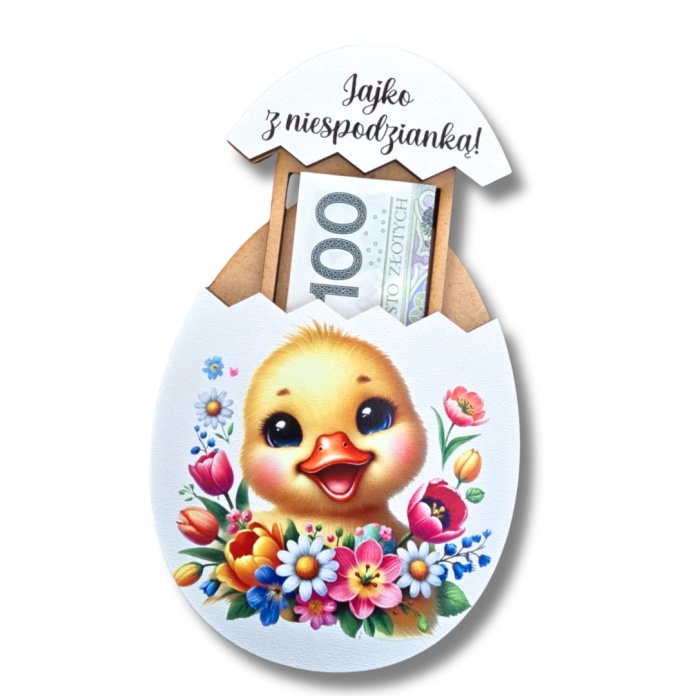 Wewnątrz jajka znajduje się miejsce na banknot. Otwierana konstrukcja sprawia, że prezent wygląda efektownie i wywołuje uśmiech na twarzy dziecka podczas świąt.