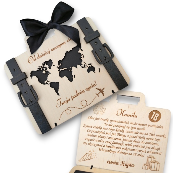 Wyjątkowy prezent na 18 urodziny w formie eleganckiej drewnianej kartki, która z pewnością zachwyci Solenizanta
