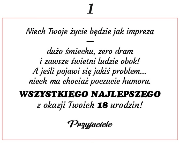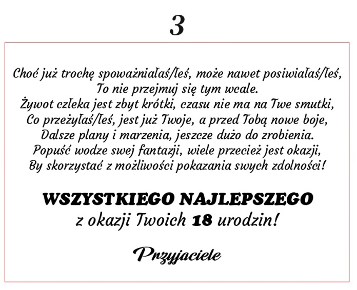 Pod wierszem możemy umieścić podpis, np.: ✔ Życzy Kochająca Rodzina ✔ Od Przyjaciół ✔ Mama i Tata ✔ Imiona osób składających życzenia.