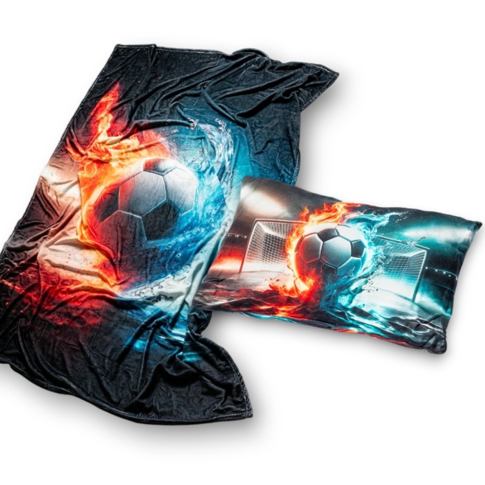 • Miękki i przytulny kocyk, idealny na wieczory z meczem, ozdobiony dynamicznym nadrukiem przedstawiającym piłkę nożną otoczoną żywiołami ognia i wody.