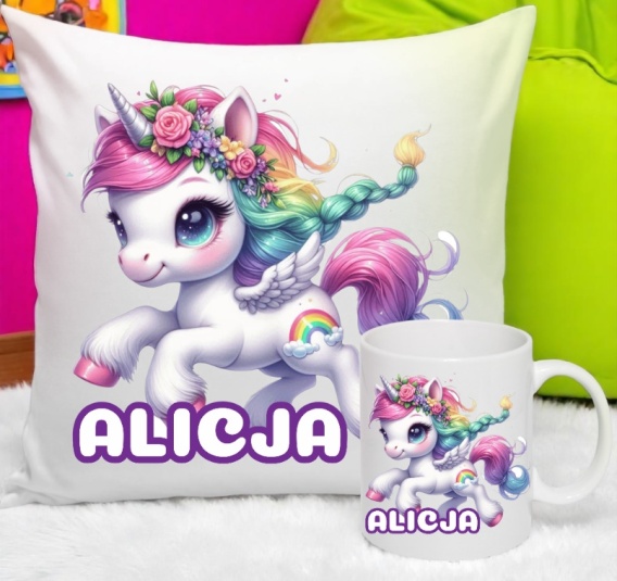 ZESTAW KUBEK I PODUSZKA JEDNOROŻEC - PREZENT Z IMIENIEM DLA DZIECI