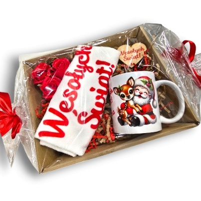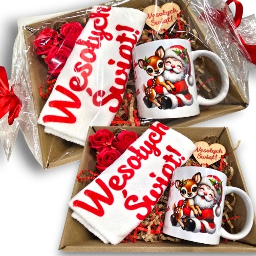 ZESTAW PREZENTOWY RĘCZNIK KUCHENNY + KUBEK Wesołych Świąt PREZENT NA ŚWIĘTA