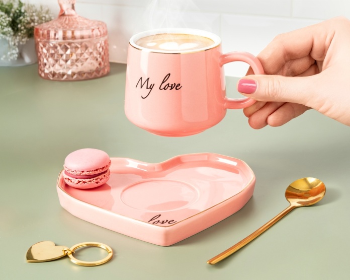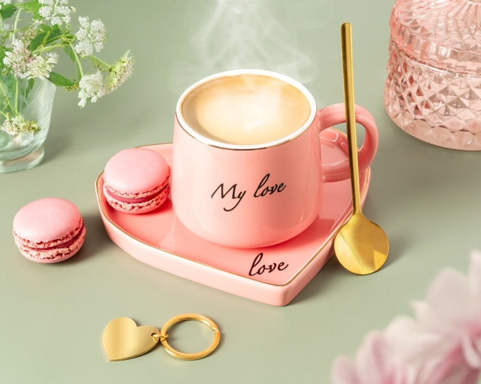Najważniejszy element tego niepowtarzalnego kompletu to ceramiczna filiżanka w romantycznym odcieniu różu, z białym wnętrzem zwieńczonym złota obwódką, z subtelnym, a zarazem wymownym napisem „My Love”. Jej kształt idealnie wpasowuje się w dłonie, sprawiając, że każda chwila z ulubionym napojem staje się jeszcze bardziej wyjątkowa. Towarzyszy jej pięknie wykonany spodek, również ze złotą obwódką, w kształcie serca – symbolu miłości, na której filiżanka odnajduje swoje miejsce. Ten pełen wdzięku akcent dodaje całości charakteru.