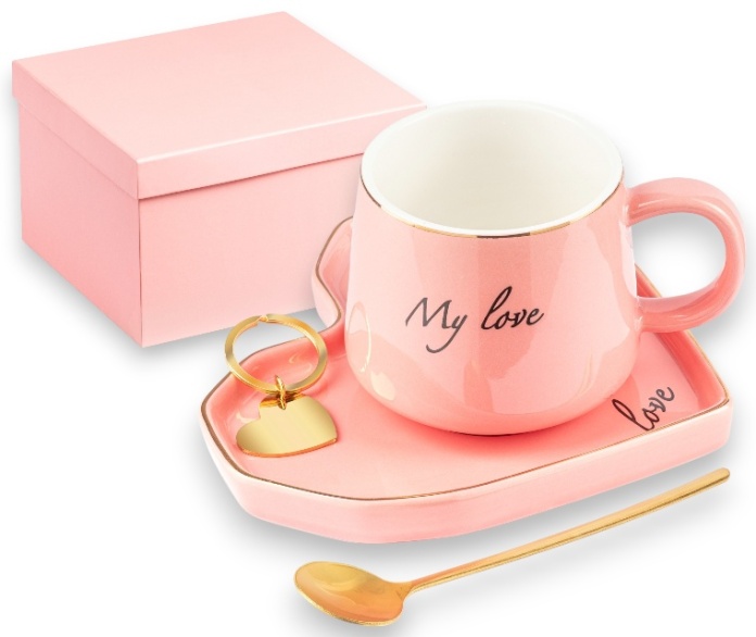 - ceramiczna filiżanka na podstawce w kształcie serca, złota łyżeczka oraz brelok serduszko (można zlecić np. dedykację u grawera)